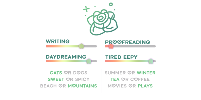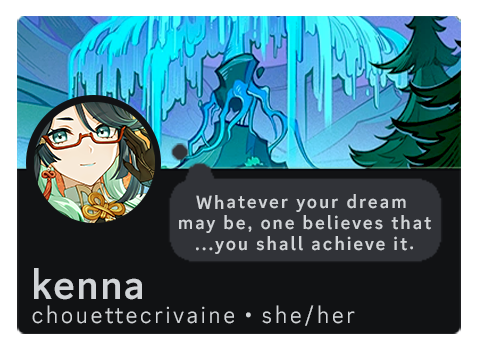 Kenna || she/her || 20+ || multifandom writing blog⚘ otome, IF, VN and anime boy enthusiast. has a problem with making too many sideblogs but hopefully - hopefully - this blog will change that and I can stay in one place! loves making character playlists and will share them until you’re sick of them. will be posting fics with OCs and friend OCs here as well if I write something I’m particularly proud of. may take a while to respond - i’m always infected with the tired eepy.⚘ Some of my favorite things are birds, pin collecting, making playlists and reading! I love hoarding stationary and I’m a psych student-in-progress, too! A little obviously, I love playing video games ^^ some of my favorites (other than the ones I write for) are otome in general, Stardew Valley, The Sims, ACNH, Tomb Raider, Minecraft, Splatoon and more!And, of course, here’s a list of my favorite blorbos ^u^